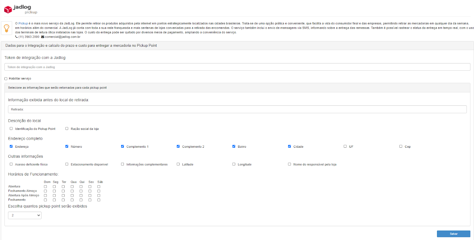 Saiba como ativar o serviço Pickup da transportadora Jadlog na Frenet Neste artigo, você vai conhecer o passo a passo para a ativação do serviço Pickup da transportadora Jadlog. A configuração é via webservice e com alguns cliques a sua loja virtual já terá acesso a esse serviço da Jadlog. O serviço Jadlog Pickup oferece a opção do cliente final retirar a sua mercadoria na agência da transportadora Jadlog mais próxima da sua residência/cidade com maior flexibilidade de dia e horário. Além disso, permite também a logística reversa, facilitando a devolução e troca de encomendas.Atenção: para a ativação do serviço Pickup da transportadora Jadlog no sistema Frenet, é necessário que você tenha em mãos um token de acesso específico para o serviço webservice. Este token é fornecido pela Jadlog. Caso você ainda não tenha essa informação, entre em contato com a Jadlog.IMPORTANTE: para ativar qualquer transportadora na Frenet utilizando o seu contrato, é necessário que você tenha assinado um plano Frenet com mensalidade.Com as informações necessárias em mãos, siga o passo a passo abaixo: No site da Frenet, clique em “ACESSAR MEU PAINEL” e faça seu login. Após o login, clique nas opções “MEIOS DE ENVIO” e “TRANSPORTADORAS”, localizada na barra lateral, à esquerda da página; Na seção “Meios de envio disponíveis para cotação na sua loja via seu contrato”, escreva “Jadlog Pickup” no campo de busca e pressione a tecla “ENTER” para efetuar a pesquisa. Em seguida, clique no logo da Jadlog Pickup; Você será direcionado para a tela de configurações do serviço; Nos campos da página, habilite e preencha as informações de configuração do serviço: TOKEN DE INTEGRAÇÃO COM A JADLOG: TOKEN (obrigatório): insira o token fornecido pela transportadora Jadlog; HABILITAR SERVIÇO: marque esse campo para habilitar o serviço em sua conta; INFORMAÇÃO EXIBIDA ANTES DO LOCAL DE RETIRADA: Este campo está disponível para personalizar o nome do serviço que será exibido em sua loja. Dica: É importante destacar que se trata de um ponto de retirada na agência da transportadora Jadlog, pois esta opção de frete será apresentada juntamente com as outras opções de entregas. DESCRIÇÃO DO LOCAL: IDENTIFICAÇÃO DO PICKUP POINT: habilitando essa opção, será apresentado o nome do serviço em sua loja; RAZÃO SOCIAL DA LOJA: habilitando essa opção, será apresentado a razão social da loja de retirada na transportadora Jadlog; ENDEREÇO COMPLETO: Deverá habilitar todas as opções que deseja que apareçam de informação da loja Jadlog para o seu cliente; OUTRAS INFORMAÇÕES: Nesta aba estão disponíveis informações adicionais. Caso deseje que alguma dessas informações sejam apresentadas em sua loja, você deverá marcar as opções que desejar; HORÁRIO DE FUNCIONAMENTO: Você deverá selecionar os horários de funcionamento da loja Jadlog escolhida por você. Essas informações serão apresentadas em seu site; ESCOLHA QUANTOS PICKUP POINT SERÃO EXIBIDOS: Nesta aba defina o número de pontos de retirada que serão exibidos como opção aos seus clientes; Atenção: Não tem um número mínimo e um número máximo de pontos de retirada. Você pode colocar a quantidade de pontos que for necessária. Para finalizar as configurações e ativar o(s) serviço(s) pickup, clique no botão “SALVAR”. Para conferir os seus serviços de entrega, clique na aba “CONFIGURAÇÃO PICKUP POINT. Nesta aba, você pode conferir os códigos de serviços que serão associados a cada ponto de retirada. Com esses códigos, é possível verificar o serviço contratado em cada um dos seus pedidos; Para saber quais são os pontos de retirada do serviço Pickup Jadlog, consulte o site da Jadlog, através do link . Para outras dúvidas, entre em contato com o nosso suporte pelo e-mail: suporte@frenet.com.br Atualizado em 11 de novembro de 2025 Palavras chaves:Jadlogregras de postagemtransportadoras Este artigo foi útil? Yes No Artigos Relacionados Qual o prazo de validade das etiquetas dos Correios, após emitidas? Depois de postada a encomenda, consigo alterar o endereço de entrega? Posso utilizar uma Nota Fiscal em mais de um envio? Qual o prazo de retorno de uma reclamação aberta com os Correios? Consigo enviar produtos na Jadlog somente com Declaração de Conteúdo? O que é redespacho de mercadorias?