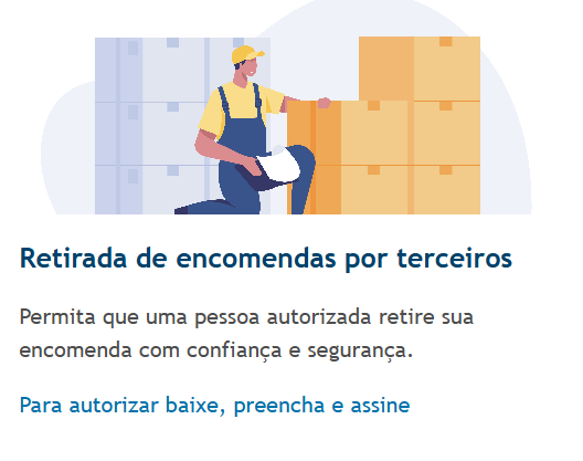 Em caso de entrega de objetos nas agências de Correios, é permitida a retirada por terceiros? Sim. Para isso, é necessario que você autorize o terceiro a realizar esta retirada, seguindo os passos abaixo: Acesse este link, role a pagina e clique no box “Retirada de encomendas por terceiros” Baixe o modelo de autorização, preencha as informações necessárias e assine. Se o objeto estiver destinado a PJ, precisará de cópia de procuração autorizando o representante da empresa, para retirada da encomenda O terceiro deverá apresentar a cópia do RG do destinatário que autorizou o representante para resgate da encomenda Atenção: lembre-se que uma encomenda somente fica disponível para retirada por um prazo máximo de 5 dias úteis. Após este prazo poderá ser devolvida ao remetente ou enviada para refugo. Atualizado em 11 de novembro de 2025 Palavras chaves:Correiosregras de postagemtransportadoras Este artigo foi útil? Yes No Artigos Relacionados Qual o prazo de validade das etiquetas dos Correios, após emitidas? Depois de postada a encomenda, consigo alterar o endereço de entrega? Posso utilizar uma Nota Fiscal em mais de um envio? Qual o prazo de retorno de uma reclamação aberta com os Correios? Consigo enviar produtos na Jadlog somente com Declaração de Conteúdo? O que é redespacho de mercadorias?