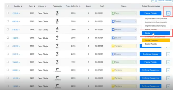 1. Localize o pedido que deseja emitir etiqueta de frete. Com o pagamento já aprovado, clique no ícone e depois selecione “ENVIAR”;