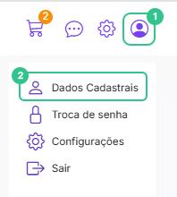 1. No canto superior direito, clique no ícone de usuário e selecione a opção “DADOS CADASTRAIS”;