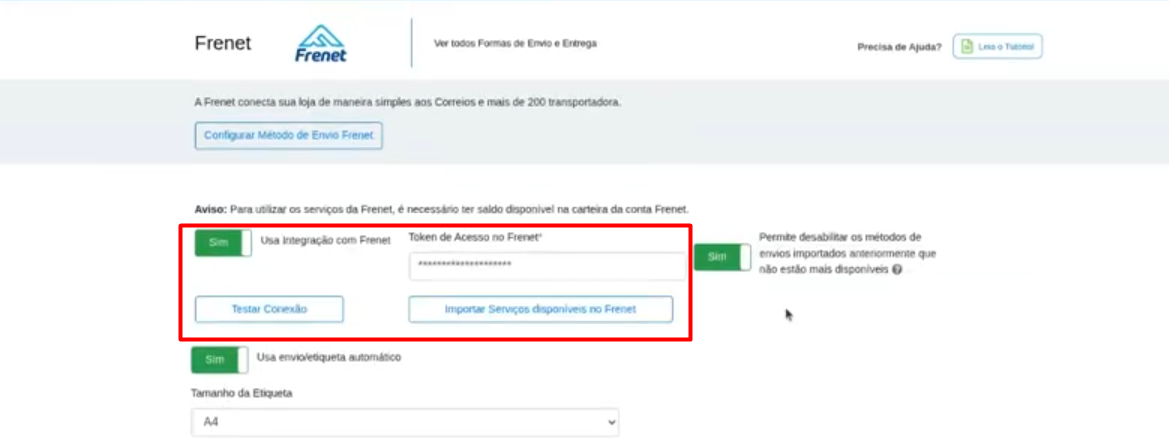 • USAR INTEGRAÇÃO COM FRENET: selecione SIM para ativar a sua conta Frenet na plataforma;