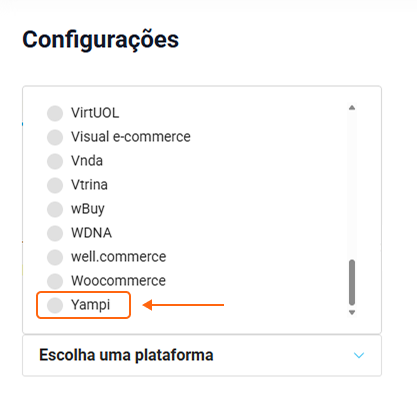 Após, na aba Pedidos, selecione Yampi na seção “Escolha uma plataforma”.