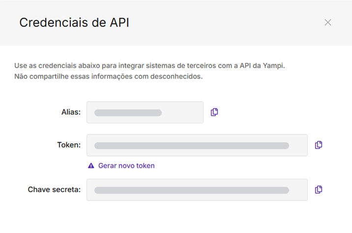Copie os dados necessários: Alias, Token e Chave secreta;