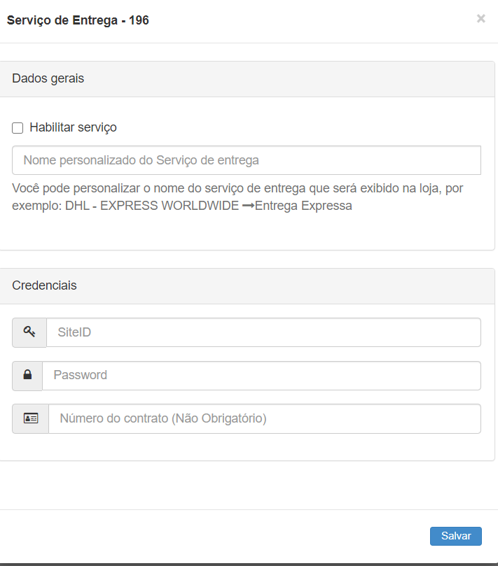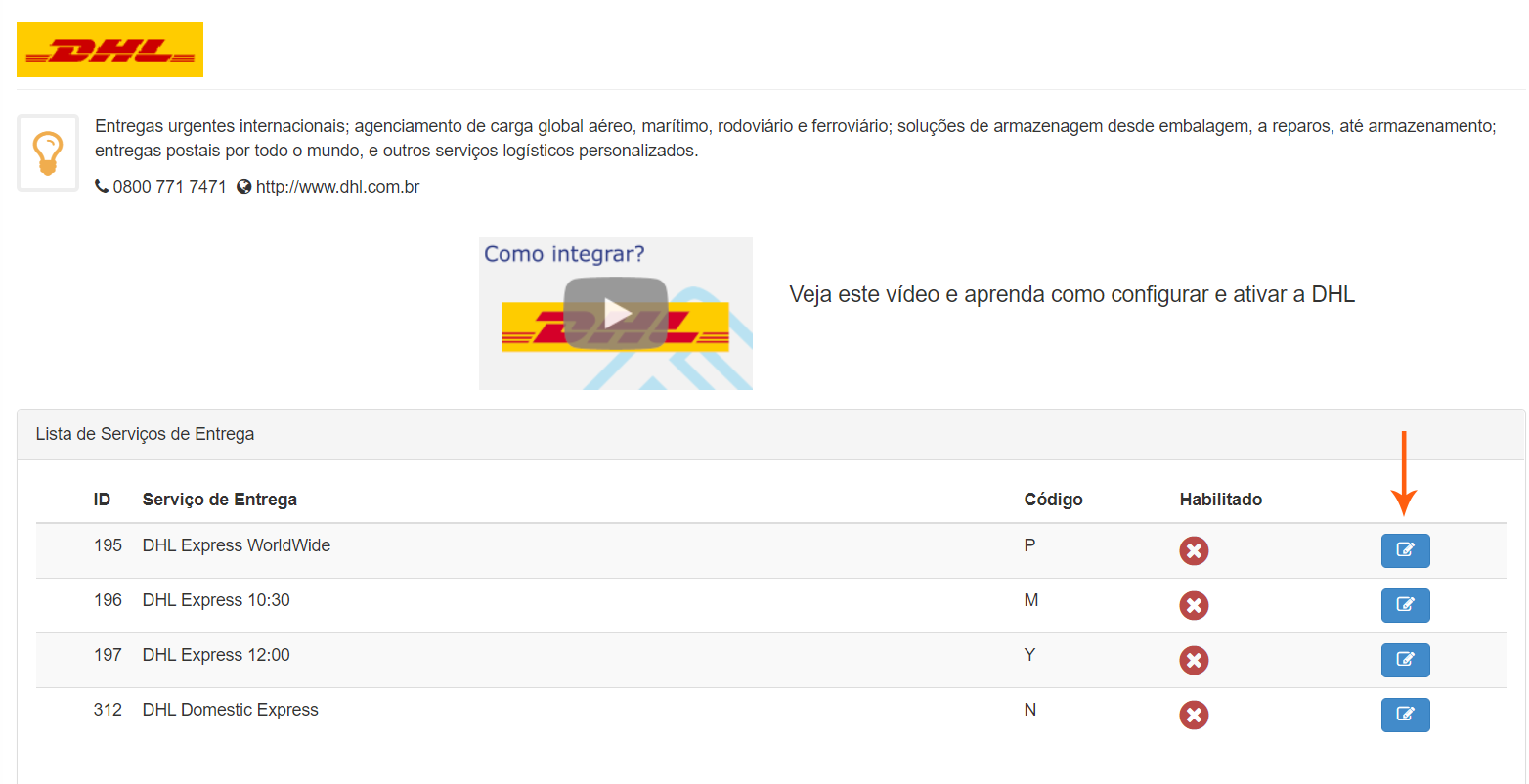 Saiba como ativar os serviços da transportadora DHL na Frenet Com este artigo você vai conhecer o passo a passo para a ativar o(s) serviço(s) da transportadora DHL. A configuração é via webservice Frenet e com alguns cliques a sua loja virtual já terá acesso aos serviços de transporte. Atenção: Para a ativação dos serviços DHL no sistema Frenet, é necessário que você tenha em mãos suas credenciais fornecidas pela transportadora. Caso você ainda não tenha essas informações, entre em contato com a sua filial de atendimento. IMPORTANTE: para ativar qualquer transportadora na Frenet utilizando o seu contrato, é necessário que você tenha assinado um plano Frenet com mensalidade. Assista o vídeo ou siga o passo a passo abaixo: No site da Frenet, clique em “ACESSAR MEU PAINEL” e faça seu login. Após o login, clique nas opções “MEIOS DE ENVIO” e “TRANSPORTADORAS”, localizada na barra lateral, à esquerda da página; Na seção “Meios de envio disponíveis para cotação na sua loja via seu contrato”, escreva “DHL” no campo de busca e pressione a tecla “ENTER” para efetuar a pesquisa. Em seguida, clique no logo da DHL; Após acessar a página da transportadora, clique no ícone para editar o serviço que deseja habilitar. Observação: caso esteja em dúvida sobre o serviço que irá utilizar, consulte a sua filial da DHL para atendimento. Após selecionar seu serviço de entrega, habilite e preencha as informações dos campos da página: Na aba DADOS GERAIS: “HABILITAR SERVIÇO”: marque esse campo para habilitar o serviço em sua conta; “NOME PERSONALIZADO DO SERVIÇO DE ENTREGA”: este campo é opcional, onde você pode personalizar um nome diferente para o serviço. Atenção: alterar o nome do serviço pode ter efeito sobre as informações que você terá disponível no pedido em sua plataforma. Sugerimos que avalie os impactos em seus processo e outras integrações. Na aba CREDENCIAIS “SITE ID” (obrigatório): ID fornecido para o serviço de produção e acesso ao sistema de cotação da transportadora DHL; “PASSWORD” (obrigatório): Senha de acesso ao serviço de produção e ao sistema de cotação da transportadora DHL; NÚMERO DE CONTRATO (não obrigatório): Número do contrato do serviço escolhido da transportadora DHL. Para finalizar a configuração e ativar o(s) serviço(s), clique no botão “SALVAR”. Pronto! Após seguir essas etapas, o(s) serviço(s) da transportadora DHL estará(ão) ativado(s) na sua conta Frenet. Para mais informações, entre em contato com o nosso suporte pelo email: suporte@frenet.com.br Atualizado em 11 de novembro de 2025 Palavras chaves:contrato próprioDHLIntegração de Tabelasintegraçõestransportadoras Este artigo foi útil? Yes No Artigos Relacionados Saiba como integrar a plataforma Vale da Web com o sistema Frenet Saiba como integrar a Frenet com a plataforma Lojcomm TUTORIAL – Integração com ERP Solares Cloud TUTORIAL – Integração com a plataforma Moovin TUTORIAL – Integração com a plataforma eCShop Saiba como integrar a Frenet com a plataforma imprima STORE