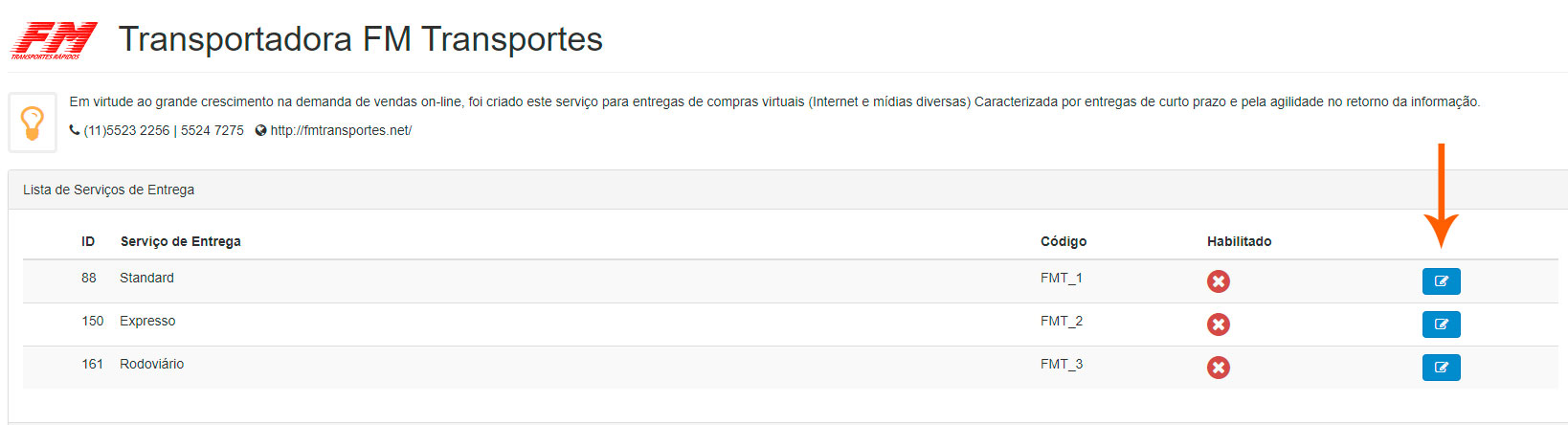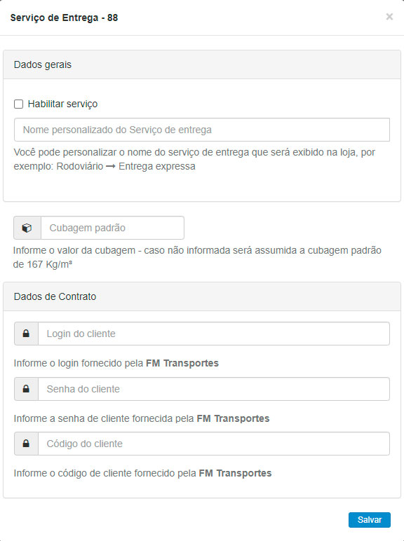 Saiba como ativar a transportadora FM Transportes na Frenet A parceria da transportadora FM com a Frenet garante maior segurança para a sua loja online. Com a ativação dos serviços FM, você tem acesso a diversas opções de fretes e formas de transporte, com atendimento de qualidade no envio do(s) seu(s) produto(s). Neste artigo, você vai conhecer o passo a passo para a ativação do(s) serviço(s) da transportadora FM. A configuração é via webservice e com alguns cliques a sua loja virtual já terá acesso aos serviços de transporte. Atenção: para a ativação dos serviços FM no sistema Frenet, é necessário que você tenha as seguintes informações: login do cliente, senha do cliente e código do cliente, fornecidos pela transportadora FM. Caso você ainda não tenha essas informações, entre em contato com a central de atendimento da transportadora. IMPORTANTE: para ativar qualquer transportadora na Frenet utilizando o seu contrato, é necessário que você tenha assinado um plano Frenet com mensalidade. Com as informações necessárias em mãos, siga o passo a passo abaixo: No site da Frenet, clique em “ACESSAR MEU PAINEL” e faça seu login. Após o login, clique nas opções “MEIOS DE ENVIO” e “TRANSPORTADORAS”, localizada na barra lateral, à esquerda da página; Na seção “Meios de envio disponíveis para cotação na sua loja via seu contrato”, escreva “FM Transportes” no campo de busca e pressione a tecla “ENTER” para efetuar a pesquisa. Em seguida, clique no logo da FM Transportes; Após acessar a página da transportadora, clique no ícone para editar o serviço que deseja habilitar; Atenção: você pode habilitar mais de uma opção de serviço; Nos campos da página, habilite e preencha as seguintes informações: “HABILITAR SERVIÇO”: marque esse campo para habilitar o serviço em sua conta; “COTAÇÕES REALIZADAS VIA WEBSERVICE”: essa opção já vem marcada automaticamente e deve continuar habilitada. “NOME PERSONALIZADO DO SERVIÇO DE ENTREGA”: este campo é opcional, onde você pode disponibilizar um nome diferente do serviço; Atenção: alterar o nome do serviço pode ter efeito sobre as informações que você terá disponível no pedido em sua plataforma. Sugerimos que avalie os impactos em seus processo e outras integrações. “CUBAGEM”: Esse campo é opcional. Preencha caso tenha uma diferenciação de cubagem de seus produtos. Através deste valor, multiplicamos o volume dos seus produtos, portanto, influencia diretamente nas cotações de frete. “LOGIN DO CLIENTE” (Obrigatório): login de acesso ao webservice da transportadora FM. Caso não tenha essa informação, verifique com a sua filial FM para atendimento; “SENHA DO CLIENTE” (Obrigatório): senha de acesso ao webservice da transportadora FM. Caso não tenha essa informação, verifique com a sua filial FM para atendimento; “CÓDIGO DO CLIENTE” (Obrigatório): código de acesso de acesso ao webservice da transportadora FM. Caso não tenha essa informação, verifique com a sua filial FM para atendimento; Para finalizar a configuração e ativar os serviços, clique no botão “SALVAR”. Para outras dúvidas, entre em contato com o nosso suporte pelo e-mail: suporte@frenet.com.br. Atualizado em 11 de novembro de 2025 Palavras chaves:contrato próprioFM TransportesIntegração de Tabelasintegraçõestransportadoras Este artigo foi útil? Yes No Artigos Relacionados Saiba como integrar a plataforma Vale da Web com o sistema Frenet Saiba como integrar a Frenet com a plataforma Lojcomm TUTORIAL – Integração com ERP Solares Cloud TUTORIAL – Integração com a plataforma Moovin TUTORIAL – Integração com a plataforma eCShop Saiba como integrar a Frenet com a plataforma imprima STORE