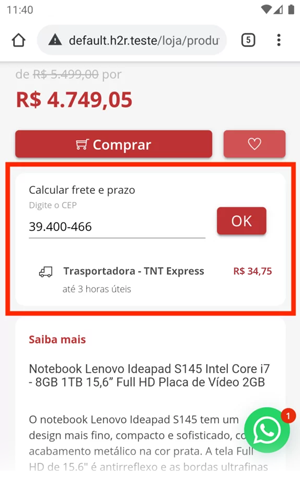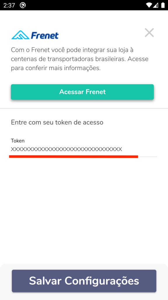 Saiba como integrar a plataforma da H2R com a Frenet em sua loja virtual O sistema Frenet permite a integração com plataformas de e-commerce de diversos parceiros, facilitando o gerenciamento das suas vendas e garantindo as melhores opções de frete. Com a Frenet, os clientes da H2R tem diversas vantagens, como até 80% de desconto no envio de frete via Correios e benefícios com transportadoras da sua preferência. Veja abaixo o passo a passo para integrar a sua loja no e-commerce da H2R por meio da Frenet. 1º Passo: Configuração no portal Frenet. No site da Frenet, clique em “ACESSAR MEU PAINEL” e faça seu login. No canto superior direito, clique no ícone de usuário e selecione a opção “DADOS CADASTRAIS”; Na seção chaves de acesso, copie o “TOKEN” disponível neste campo da página e guarde para inserir na plataforma da H2R; Atenção: Para ativar o TOKEN na Frenet, é necessário que todos os dados cadastrais sejam preenchidos e que você realize uma verificação que será enviada no seu email cadastrado. 2º Passo: Configuração na plataforma H2R. Acesse seu painel administrativo na H2R, efetuando login por meio do aplicativo Android. Após o login, clique no menu do aplicativo localizado no canto superior esquerdo. Selecione a opção “CONFIGURAÇÕES”; Em seguida clique na opção “FRETE”; Na tela será exibida as configurações de frete. Role a tela para baixo até encontrar a “FRENET” e ative essa opção selecionando o marcador. Insira o seu token “FRENET” no campo indicado. Clique no botão “SALVAR AS CONFIGURAÇÕES” para integrar a sua loja virtual com as transportadoras disponíveis na Frenet. Após realizar esse passo a passo, o seu cliente pode calcular fretes pela FRENET digitando o CEP da região. Para outras dúvidas, entre em contato com o nosso suporte pelo email: suporte@frenet.com.br Atualizado em 11 de novembro de 2025 Palavras chaves:H2Rintegração de pedidosintegraçõesPlataformas Este artigo foi útil? Yes No Artigos Relacionados Saiba como integrar a plataforma Vale da Web com o sistema Frenet Saiba como integrar a Frenet com a plataforma Lojcomm TUTORIAL – Integração com ERP Solares Cloud TUTORIAL – Integração com a plataforma Moovin TUTORIAL – Integração com a plataforma eCShop Saiba como integrar a Frenet com a plataforma imprima STORE