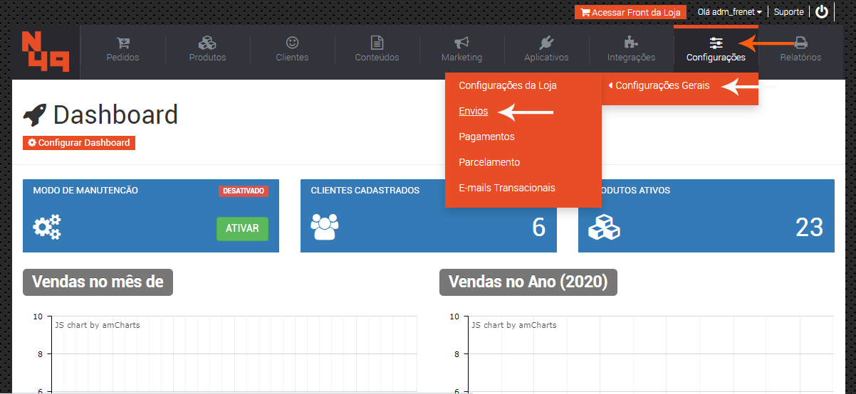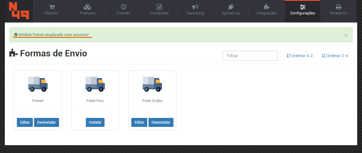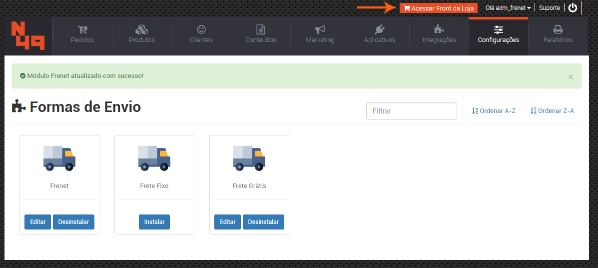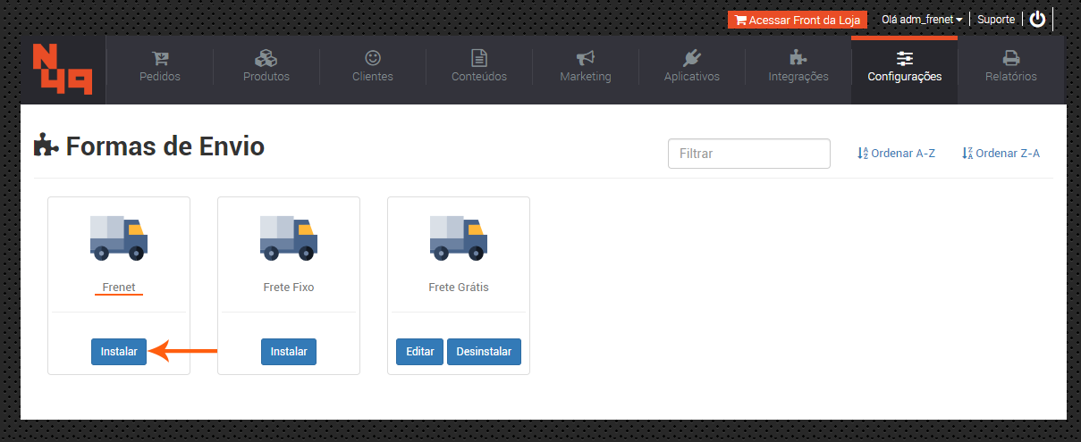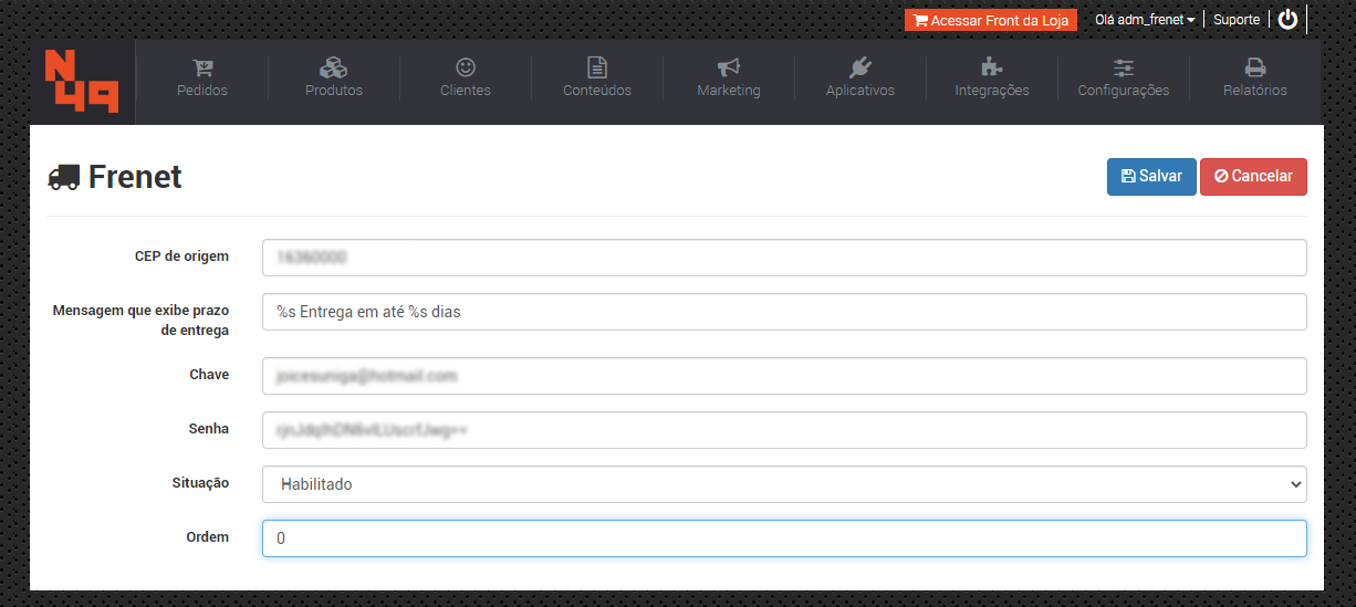 Saiba como integrar a plataforma da N49 com a Frenet em sua loja virtual O sistema Frenet permite a integração com plataformas e-commerce de diversos parceiros, facilitando o gerenciamento das suas vendas online e garantindo as melhores opções de frete. Ao integrar a N49 com a Frenet, você tem qualidade com suporte especializado em frete para o seu e-commerce, além de indicação de transportadoras conforme o seu perfil de negócio. Veja abaixo o passo a passo para integrar a sua loja no e-commerce da N49 por meio da Frenet. 1º Passo: Configuração no portal Frenet. No site da Frenet, clique em “ACESSAR MEU PAINEL” e faça seu login. No canto superior direito, clique no ícone de usuário e selecione a opção “DADOS CADASTRAIS”; Copie e guarde as informações “CHAVE” e “SENHA” disponíveis nestes campos da página, pois serão necessárias na plataforma da N49. 2º Passo: Configuração na plataforma N49. Acesse seu painel administrativo na N49 efetuando login por meio do site. Ao efetuar o login, clique na opção “CONFIGURAÇÕES” localizada na barra superior da tela. Em seguida, selecione as opções “CONFIGURAÇÕES GERAIS” e “ENVIOS”. Na tela de formas de envio, clique no botão “INSTALAR” da opção “FRENET”. Preencha todos os campos da página conforme o print abaixo, incluindo suas informações de: “CEP DE ORIGEM”: inserir o cep de origem da sua loja; “MENSAGEM QUE EXIBE PRAZO DE ENTREGA”: manter o mesmo texto que aparece na tela do print abaixo: %s Entrega em %s dias; “CHAVE”: inserir ou manter chave da Frenet; “SENHA”: inserir ou manter senha da Frenet; “SITUAÇÃO”: deixar sempre habilitado; “ORDEM”: deixar sempre o número 0; Depois, clique na opção “SALVAR”. A página deve exibir a mensagem “Módulo Frenet atualizado com sucesso!” Clique na opção “ACESSAR FRONT DA LOJA” localizada na barra superior da página para verificar a integração Frenet com a sua loja. Para conferir se a integração foi feita com sucesso, escolha um produto de sua loja e faça o cálculo do frete com um CEP de destino. Aparecerá o nome da Frenet como no print abaixo. Para outras dúvidas, entre em contato com o nosso suporte pelo email: suporte@frenet.com.br Atualizado em 11 de novembro de 2025 Palavras chaves:integração de pedidosintegraçõesN49Plataformas Este artigo foi útil? Yes No Artigos Relacionados Saiba como integrar a plataforma Vale da Web com o sistema Frenet Saiba como integrar a Frenet com a plataforma Lojcomm TUTORIAL – Integração com ERP Solares Cloud TUTORIAL – Integração com a plataforma Moovin TUTORIAL – Integração com a plataforma eCShop Saiba como integrar a Frenet com a plataforma imprima STORE